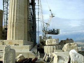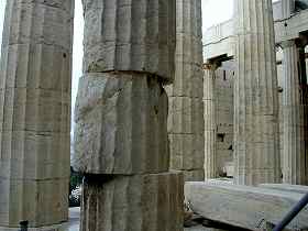 | パルテノン神殿の大理石の柱は こうして積み木の様に、積み重ねられています。 一つ一つの円柱の石の中にはドーナツのように 穴が開いていて、心棒が通っているとのこと。 その心棒は最初紀元前5世紀に建てられた時には 何が使われたでしょうか?(←クイズ2−1) その後の修復(100年前)では「鉄」が使われたそう ですが、鉄が膨張して周囲の大理石を破壊するため 現在は、鉄の代わりに○○○(←クイズ2−2) を使用して修復が行われているそうです。 |