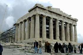 | これが有名なパルテノン神殿。 但し、現在修復中で、中には入れない。 どこのサイトで調べても、いつも「現在修復中」 って、一体いつ修復が終るのでしょう? でも今回思ったのですが、修復された建造物は 確かに「昔の人はスゴイものを造ったんだなあ」 という驚きは与えて頂けますが、そこには既に 紀元前から・・・、という歴史を感じる感動が抜けて しまうのでは?と。 美術を感じる?だけになってしまうのでは、と。 |