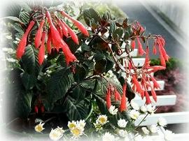 ![]() 二階の部屋の出窓で咲く変種フクシア。 |