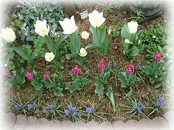 一番上の花壇の一部を上から写したものです。 実際には白とワイン色のチューリップの間にもムスカリを植えているのですが、まだ小さくてこの写真では余りはっきり見えません。 花の色や花の大きさを考えながら花壇をレイアウトするのも、楽しみの一つです。 |