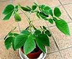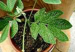 → | ![]() 6月12日、本葉が突然いっぱ い!根も鉢底から出てきました。 撮影後、素焼き鉢に植え替えを。 |