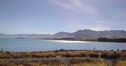 透明度の高いテカポ湖に太陽の光がまぶしく照らしつける。