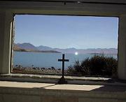 テカポ湖畔にある「善き羊飼いの教会」の窓よりテカポ湖を眺める…。