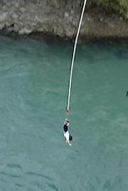 カワラウ川に掛かる橋の上か⇒らバンジー・ジャンプに挑む香港女性(旅行者)。目もくらむような43mの高さから。地元の人でも挑戦する人は少ないという。
