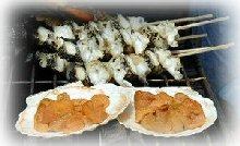 海岸沿いの露店で、 焼かれるのを待つつぶ貝と生うに 焼き上がったものは、次のページに(^ー^)ノ