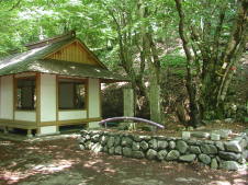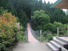 (3) 登山口の休憩所から登山口のつり橋を望む。 |