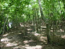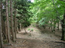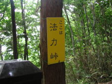 景色を堪能して、観音峰頂上へ向かう、ここからは山道、いくつかの小さなピークを乗り越えて、三等三角点の立つ観音峰頂上に着く。頂上は林の中にあって見晴らしはきかない。ここから杉の植林と自然林の境界に沿って山道が続く。さらに進んで三塚のピークをに着く。こちらも林の中にあり見晴らしはきかない。ルートにはこれでもかというくらいテープが巻かれていて迷うことはない。しばらく尾根道を進んだあと急な下りに変わると法力峠につく。