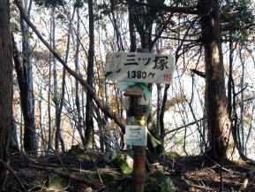 三塚 1380m 観音峰から法力峠よりにあるピーク。こちらも林の中にあり見晴らしはきかない。 |