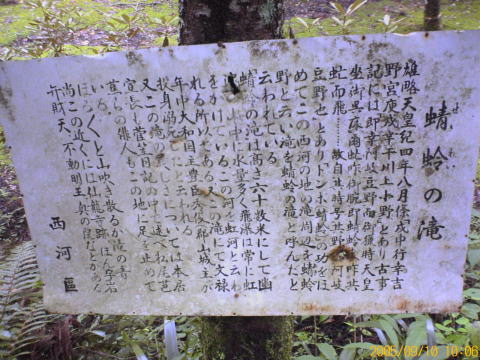 すぐ右手にあきつの小野スポーツ公園を見ながら、林道をもう少し先へ進み蜻蛉の滝公園に入る。公園に入ってすぐ左の公衆トイレ(桜乃香和家)の横の橋を渡り、石の鳥居をくぐって石段を登っていく。昨日の雨で石段がぬれていて滑りやすい。すぐ左手にお堂がある。更に石段を登ると滝の展望台の東屋にでて正面に蜻蛉の滝を眺める。落差は大きくないが一枚岩の岩盤を流れ落ちる様は見ごたえがある。昨日の雨のせいか、いつもこうなのかわからないが、豊富な水量で、ごうごう流れ落ちる滝に見とれてしばらく足を止める。