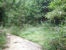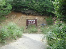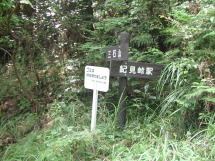 林道歩きにも飽きが来た頃に道は舗装路から地道に変わりすぐになだらかな下りになる。しばらく下ったあと再び舗装路に変わり右に急カーブするところに分岐がある。ここまで紀見峠駅から約1時間半と結構長い、分岐には立派な三石山の標識が立つ。ここを左折するとすぐに登山口がある。真っ直ぐ行くと高野口や岩湧山方面に行ける。