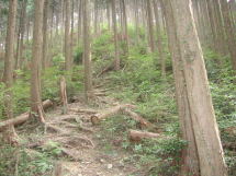 (14) 登山口を入ると、すぐに木の根っこが露出した急坂が始まる。 |