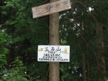 登山口からは木の根っこが露出した自然階段のような急坂を一気に頂上まで登る。若干藪の茂ったところもあるが大したことはない。勾配はきついが道もそんなに荒れてなくて歩きやすい。でもあまり人も通ってないので所々くもの巣に引っかかって気持ちが悪い。頂上は木に囲まれた小さな広場になっていて中央に三角点があり、そばに小さな地蔵さんが置かれ木にはボーイスカウトなどが架けた三石山のプレートが掛かっている。誰もいない。今日はここまで高山林道でススキを取って帰る男性とリュックを背負った男性にすれ違っただけ。