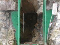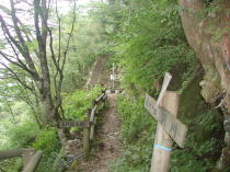 ここで車道と別れ右へ登山口に進む。登山口を入ると杉の植林に囲まれた薄暗い道が緩やかに上って行く。すぐに参拝道を横切り、歩きやすいように板をかぶせた材木運搬用のモノレールを乗り越え、木製の橋を渡る。ここから小さな石ころがゴロゴロした道を上がっていくと五代松鍾乳洞の下の入口の前に出る。鍾乳洞の前には以前にはなかったコンクリートの基礎が作られており何か建物を作るのかも?いつもは閉まっている鉄扉が開いていたので写真を撮った。観光客が見学に入っているのかも。階段を右に上がり鍾乳洞の上の口に出る。やっぱり中から観光客がゾロゾロでてきた。鍾乳洞の前を左へ進む。途中少し岩がせり出した場所を通り抜け歩いていると前から小学生とお父さんか二人づれとすれ違った。すぐに母公堂からの登山道と合流する。今日はじめて気付いたがここの新しい道標には「母子堂」と書かれている。正しくは「母公堂」だと思っていたのにどちらが正しいのか自信がなくなってきた。
