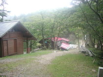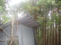 ここからしばらく進むと植林から明るい自然林に変わり南側の山腹を捲くように緩やかに上って行く。途中、危険な箇所には鉄製の桟橋がいくつも架けられている。単独行の人とすれ違う。つづいて5名くらいのグループとすれ違う。後のほうからもにぎやかな声が聞こえてくる。何か声を掛け合いながら歩いているようだ。いくつも桟橋を過ぎ、崩落した桟橋を迂回してあといくつか桟橋を渡ると稲村小屋バイオトイレの屋根が見えてきて山上辻に着く。山上ヶ岳からの道が左から合流する。稲村小屋は営業している。小屋の前は広場になっていて何人か先客が休憩している。あとから声を掛け合っていたらしいグループも到着する。少し霧がかかってきて雲行きも怪しいので、ここで先に昼食をとることにする。ラーメンのミニパックと携帯コンロを取り出しお湯を沸かしている間におにぎりを食べようとリュックの中を探すがどこにも無い。家に忘れてきたみたいでがっくりするが気を取り直してラーメンを食べる。ミニパックなのでちょっと物足りない。食後にコーヒーを淹れてゆっくり味わう。いつもながら山で味わうコーヒーはなんとも旨い。