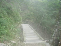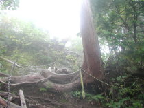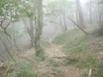 入れ替わりに山頂を後にし下る。岩場や鎖、桟橋、梯子などが雨で濡れて滑りやすいので慎重に下る。途中で先ほど道を訊ねられた人とすれ違う。大日のキレットまで無事に戻り、山上辻に向う。山上辻も濃い霧が出ている。休憩している人もいない。雨がひどくなってきても嫌なので、このまま山上辻を通過して法力峠へ向う。法力峠の手前くらいまで来ると雨は上がるが、霧はうっすらかかっている。これから登っていく人とすれ違う、今の時間からだと稲村小屋に泊まるのかも。順調に法力峠まで戻る。勾配がゆるいので下りでも足への負担が少ない。法力峠も通過して途中の水場でタオルを絞っていると、鈴の音がして頂上付近で道を訊ねられた人が下ってくる。言葉を交わし先に行ってもらう。母公堂との分岐で先ほどの人が写真を撮っている。また声をかけここから稲村ヶ岳登山口を経て洞川温泉まで一緒に歩く。この人は奈良県曽爾のほうの方で昨年から山歩きを始めたそうだ。今日は観音峰登山口から縦走して稲村ヶ岳を回ってこられたようで随分健脚のようだ。