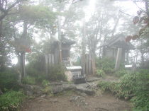パラパラ雨が落ちだしてきたので山頂を後にして来た道を戻る。少し戻ったところで単独行の人に道を訊ねられたので教えてあげる。大日のキレットのところから左上へ登っていく。ここには以前、大日山を指す道標と置き引き注意の看板があったはずだけど今日はどちらも無い。少し登ったところで雨がひどくなってきたのでカメラにビニール袋を被せ、リュックにもカバーを被せる。大日山頂上までは僅かな距離だが、鎖や木の根っこを頼りに岩を攀じ登り。梯子や桟橋を渡り山頂へ着く。山頂には小さな祠が2つ祀られている。こちらも濃い霧で景色は何も見えない。祠にお参りしていると、先ほどのグループがにぎやかに登ってきた。