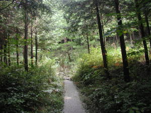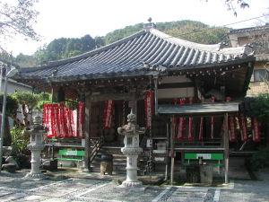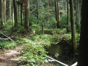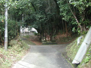 左へ行くとダイトレ紀見峠を経て岩湧山や槇尾山方面へ行ける。右へ行くと林道を通って金剛山方面に行けるが少し遠回りになる。ここは道標に従い斜め右の林の中のセメント舗装された道を進む。昨日の雨のせいか道には川のように水が流れている。ジャブジャブ言わせながら先へ進む。5分ほど歩くと先ほどの林道と合流する。左へ進みすぐに橋を渡りほんの少し歩くと水源地の横に出る。最初の小さな橋をやり過ごし2番目の橋を右に渡る。ほんの少し平坦な道を歩いたあと、長く急な木の階段が始まる。ゆっくり登り切るとほんの少し平坦な道があり、また、長く急な木の階段が続く。木の階段が終わり小さな起伏を越えて平坦なところに出ると左にブンタ谷道の分岐がある。ここを左へ行くと羊歯が群生するブンタ谷道を通って島谷の集落を経て南海天見駅へ出ることができる。ここも直進してしばらく歩くと西ノ行者へ出る。右の細い道をほんの少し進むと崖の所に西ノ行者堂が祀られ。