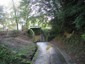 (19)セメント舗装された道。雨の後なので川のように水が流れている。ここは左折する。