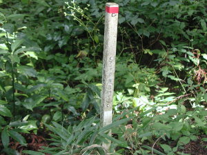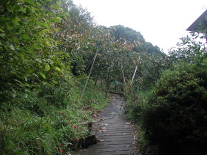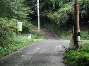ここには金剛南尾根縦走路入口と書かれた小さな柱が立っているが消えかかっているので注意していないと見落とす。すぐ柿の木の枝が道にせり出しているところを注意しながら通り抜け道は林の中に入り左手に紀見配水池がでてくると道は平坦な地道に変わる。少し歩くと右手がほっかり開け下に畑が見える。また林の中に入り、すぐにダイトレ山の神に合流する。