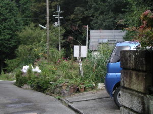 (14)ここを右折して、青い車の向こう側を入っていく。道標には金剛南尾根縦走路入口と書かれている。