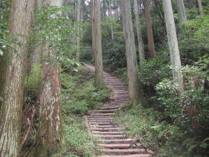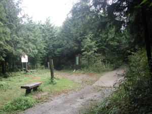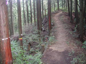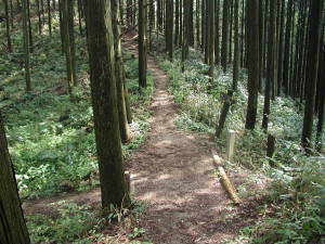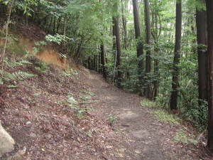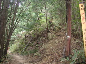 大沢塞跡を過ぎるとまた道は軽い下りに変わりさらに木の階段に変わる。このあたりはR310金剛トンネルの上にあたり自動車の通過音が聞こえる。少し路面の荒れた道を登るとまたなだらかな道に変わり。神福山の分岐に着く。