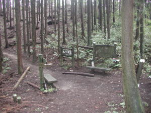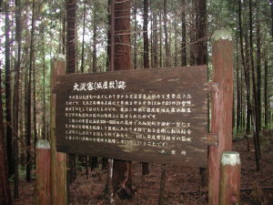 ここも直進して杉尾峠に着く。右から巨石で有名な杉尾の不動山からの林道が合流する。ここも直進して軽いアップダウンを繰り返すと行者杉に着く。行者杉には東之行者堂が祀られているのでお参りする。付近は開けた広場になっており休憩する人も多い。ここで道は3つに分かれ、真っ直ぐ進むとR310金剛トンネルや五条の大沢寺へ下ることができる。ここは斜め前方左上へ木の根っこが露出した道を進む。少し登ったあと、道は緩やかな下りになり平坦な道に変わると右手に大沢塞跡の説明板が立っている。南北朝時代にはここに要塞があったようだ。