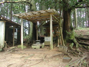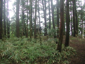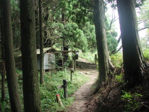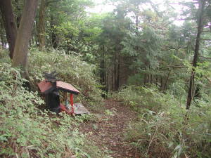 標識に従い急な細い道を上って行くと1分ほどで頂上に着く。頂上は小さな広場になっていて小さな祠が2つと葛城第19経塚が祀られている。お参りして早々に登ってきた方向とは反対側に下る。1分ほどで先ほどの分岐から金剛山方向に少し進んだ地点に出る。今日はここまでにして来た道を戻る。 |