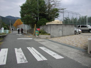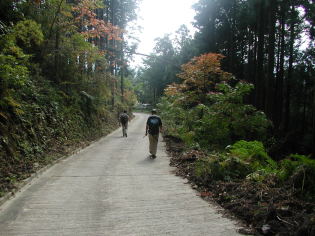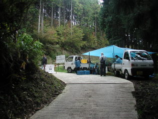 ここから舗装された林道をセンター歩く。センターの手前で右折してしばらく進み。次の分岐を左へ急坂を上って行くと高野から大峰にかけての大パノラマが開ける。しばらく景色を堪能して。さらに上がっていくと木製の展望台が整備されている。ここから急坂を下ると先ほどの分岐へ戻る。センターでおにぎりと豚汁、それに柿も一切れいただいて、ふたたび歩き出す。あとはひたすら林道を下り。農免道路を渡りゴール地点の西川の臨時バス停へ到着する。ここでバスがくるまでしばらく待つ。
