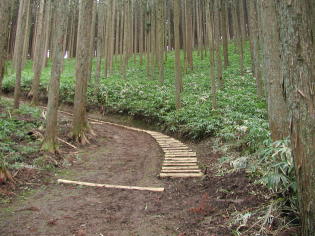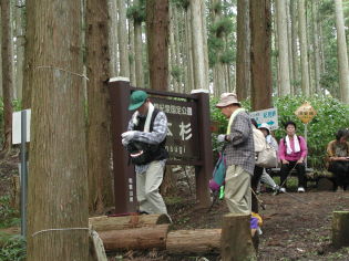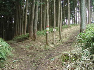 一本杉数百メートル手前で林道からそれ左の旧道を登って行く。ここからやっと地道に変わるが、よく整備された広い道で急な部分には木の階段が設置されていて、すぐに一本杉に着く。一本杉には小さな祠があり、左へ杉林の中の道を行くと道は二つに分岐する。右へほんの少し行くと南葛城山の頂上に出る。頂上は林に囲まれた広場でベンチが置かれている。周りは一面熊笹が茂った杉林。