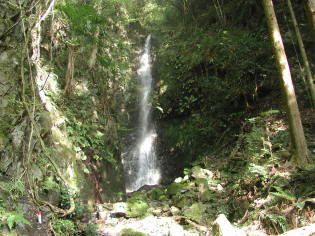 ここから来た方向とは反対側に下っていくと、すぐに舗装された林道に出る。このあたりは道標が少なく作業道や林道が錯綜しているので注意が必要。ここからしばらく林道を下り、途中から林道をそれて左へ清水の滝のほうへ下る。これは山腹につけられて細い道で、途中に立派な清水の滝がある。滝を過ぎてしばらく行くと景色が開ける。道はしっかりしているが、注意して歩かないと危険な箇所もある。しばらく下ると元の林道へ合流する。