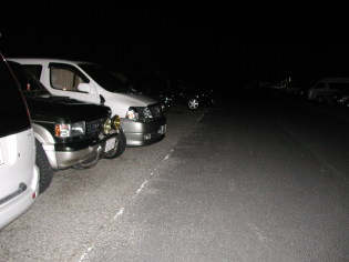 (1)夜中の1時ごろに駐車場に到着。車がたくさん止まっている。
