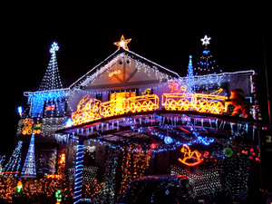 | 私のお気に入りは、このプレゼントの箱の飾りつけ。 電気で自動に開いたり閉じたり。。。 夜の真っ暗な中、浮き出るように飾られたこの箱・・・ じっと見ていると、とても幻想的な気分になります。 |