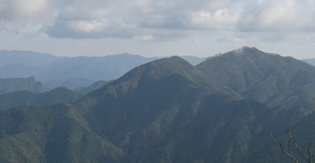 2004年4/30 自宅を5:00に出発。4回目の和歌山の山行きです。今回は大塔山(1122m) 4月末、あけぼのつつじの咲くころを狙って大塔山に行ってきました。 昨年通った、法師山登山口の宗小屋橋を抜け、林道安川大塔川林道を本宮に向かって大杉隊道トンネルをぬけ弘法林道入り口に駐車。そこから、歩き始めました。(上の写真は法師山から撮影したもの。手前が二の森、奥側が一の森) 8:15〜1067m峰(11:15)〜大塔山(11:35〜12:20)〜下山(14:20)