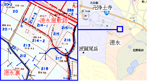| *徳永村・・・現在の大山新と北野新田の間にあった村で、現在は字名だけが残っています。徳永は中沢姓で、一印谷の中沢氏と区別するため、徳永中沢家と呼ばれています。 現在は転出されていますが、徳永中沢家は荒子新田を開発した豪農でした。現在国道沿いにある浄土寺は、元々徳永村にあり徳永中沢家の菩提寺でした。 | ||||||||||||||||||||||