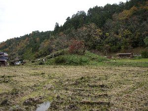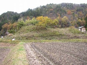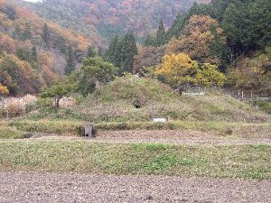| 洞中2号墳(曽地中) 墳丘長30m、後円部径18m、高さ5.5m、前方部幅18m、高さ4mの前方後円墳です。墳丘主軸とほぼ45度の角度をもって、南西方向に横穴式石室が開口しています。羨道は長さ5.7m、高さ幅ともに約1m、石室は長さ5m、高さ2.5m、幅1.9mを測ります。 1・2号墳ともに遺物は伝えられておらず、石室の形態から1号墳を6世紀後半、2号墳は1号墳に先行する時期と推定されています。 |