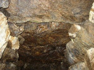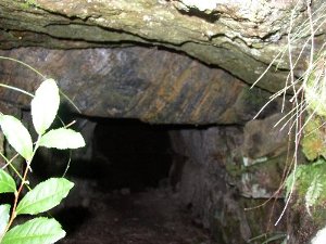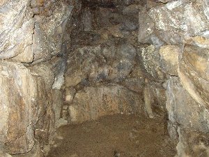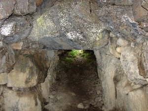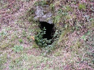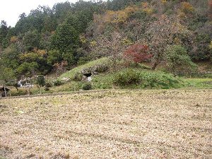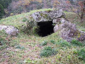 | 洞中1号墳(曽地中) 横穴式石室が南西に開口している円墳です。墳丘の直径20m、高さ5m。羨道部は高さ平均1.7m、幅1.6m。羨道の長さは現在5mですが、更に5m程長かったことがうかがえます。玄室は両袖式で、長さ6.6m、幅2.4m、高さ3.5mを測ります。丹波最大級の石室といわれています。 |