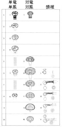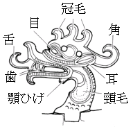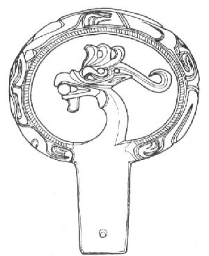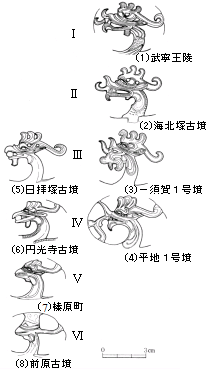 山田2号墳のものは玉を咥えず、口を閉じています。また、冠毛はくっつき3本の刻み目で表され、後毛が環にくっついています。そして、環のまわりには竜が彫られているのですが、鱗(うろこ)がなく不鮮明な状態です。 現在人の感覚からすると、技術の進歩と共に精巧な造りになってよいはずですが、当時は、オリジナルの模倣を繰り返すことによって、あるいは大量生産されるようになると、形や模様が退化していきます(粗悪になります)。山田2号墳のものは大量に生産された時期にあたるようです。 |