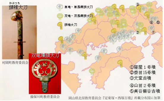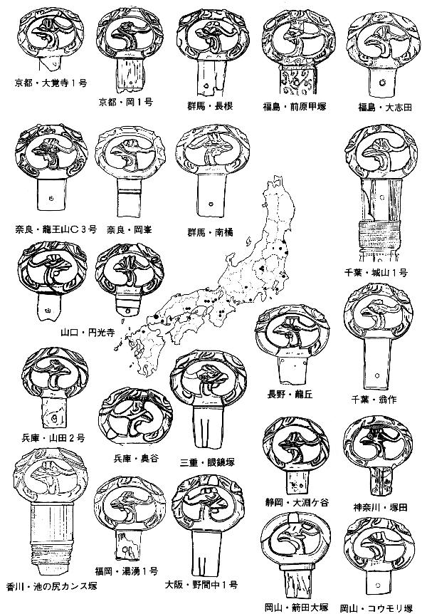 ![]() 龍王山系列の単鳳環頭大刀の出土例とその分布図(縮尺不同) 「兵庫・奥谷」とあるのは、篠山市殿町の奥谷蕪谷古墳出土の単鳳環頭大刀柄頭です。退化状況からみてY式となります。 |