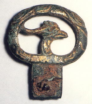 単鳳環頭大刀 単鳳とは鳳凰が1羽、環頭とは柄頭が環状をなしているということを示しています。一般に、太刀は平安時代以降の反りをもつ刀を指し、大刀は古墳時代・奈良時代の直刀を指します。また、金銀で飾られた大刀は、装飾付大刀と呼ばれています。 単鳳環頭大刀とは別に単竜環頭大刀というのがあります。よく似ているのですが、口から舌を出し、上下1本ずつの歯があるのが竜、玉を咥えているのが鳳凰です(2)。 |
