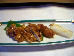 淡路島へ上陸し、海産物の竹中水産に寄り わかめ・めかぶ等購入。 うずしお温泉ゆとりっくで疲れを癒し、民宿おれんじ荘さんで、鱧料理を頂く^^ まずは先付け |