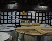 この蔵には、入れなくて2階からガラス張りの部屋から撮影。蔵内は醗酵には欠かせない音楽が流されています。音楽で味も変わるんですよ。 |
