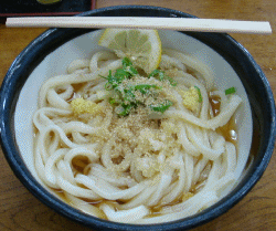 shin_oさんは、この店で3軒目。nonaさんは2軒目。「釜ぶっかけ」を注文し薬味を入れてレモンを絞って、さっぱりと頂きました。この店のうどんは結構ボリュームが有ったので、かずぱんさんは「後2軒行くんですねと?}と食べれるか心配そうでした。確かに! |