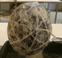 色んな見本が有り 参考にして作ってみます。風船のベースに風船に紙が張り付かないように黒い生地がベースです。最初に紙の糸で好きなように巻いていきます。 |
