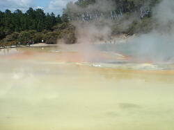 あらゆる色の熱水/冷水池や蒸気が吹き出す噴気孔です。この色は水位や風向きで変化します。 |