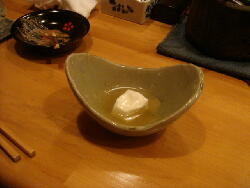 ゆし豆腐(おぼろ豆腐)のアーサ(海草)お汁とマクブの刺身にんにく味噌です。 |