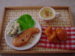| トーストは実際に粘土に気泡を入れて、焼き色をつけました。 プチトマトのへたが時間かかったわあ。 カリカリベーコンは、朝の必需品ですよね〜? |