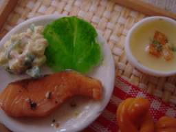 | カツレツの上にはトローンとチーズが・・・ チーズ大好き!! 本物の鮭のムニエルを作る時にも乗せたりしてます!! カツレツは作ったことないけど〜揚げ物苦手・・・ スープは野菜たっぷりチャウダーです。ブロッコリーが 面倒だったわ〜 |