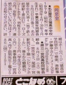 7月15日(月)の中日新聞朝刊に猪高中学校卒業35周年同窓会の案内が掲載されました(愛知県内)。