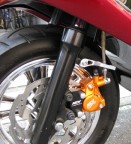 当店オリジナルのマフラーです。ステンレスとチタンの2種類です。価格は、ステンレスが、¥33,600 チタンが\39,900です。これから注目の1台です。YBR125Kにも流用できますのでそちらの方がリトルレーサー気分になれるかも!フロントのブレンボ化完成です。