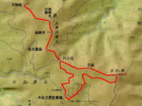 | コースタイム(参考) 川上辻 (20) → 名古屋岳?(25) → 如来月?(10) → 如来月の肩?(10) → 県境尾根ピーク (15) → 如来月の肩?(15) → 大和岳 (50) → 川上辻 |